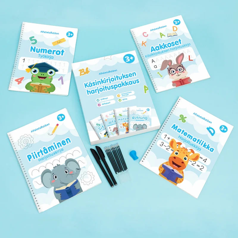 Tämän uudelleenkäytettävän käsialaharjoitussetin avulla lapsesi voi harjoitella kirjoittamista yhä uudelleen ja uudelleen ilman, että hänen tarvitsee ostaa uusia harjoituskirjoja.