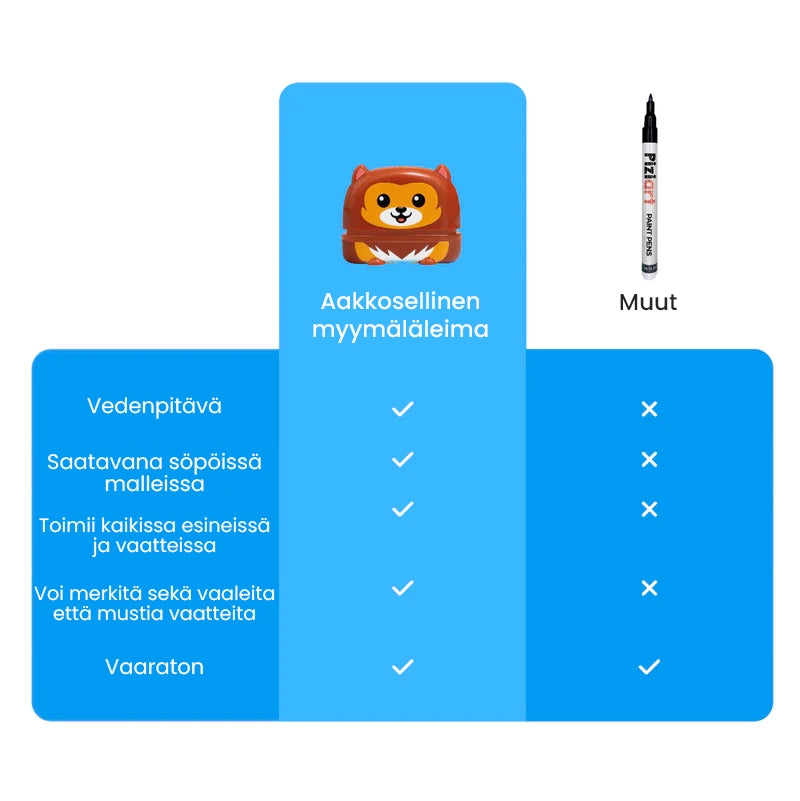 Ainutlaatuinen leimasimemme on suunniteltu vedenpitäväksi. Se kestää jopa 50 pesua haalistumatta! Vaikka muste on suunniteltu tarttumaan välittömästi, suosittelemme odottamaan 48 tuntia ennen vaatteen pesua.